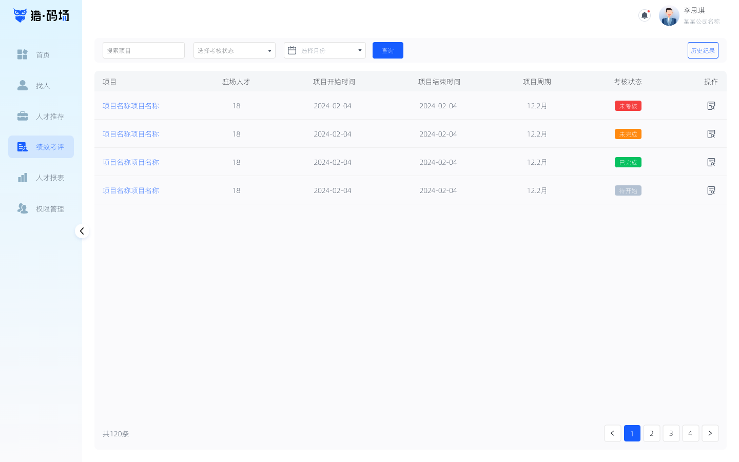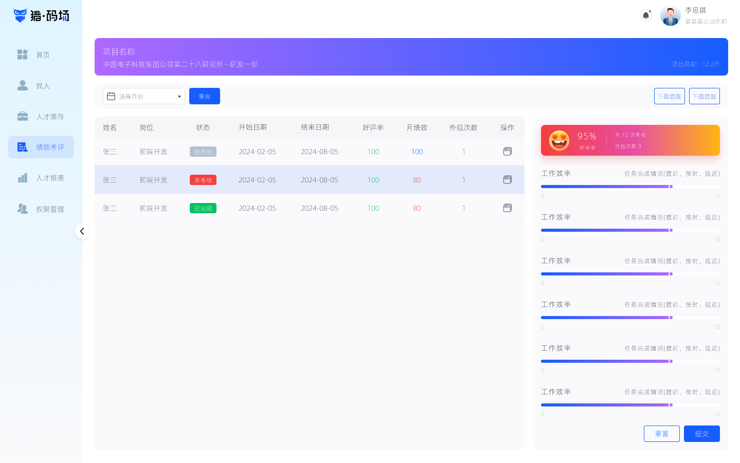 在绩效页面中,左侧显示人才列表,右侧显示展示对应的考评纬度,对该人才打分点击「提交」即可。
