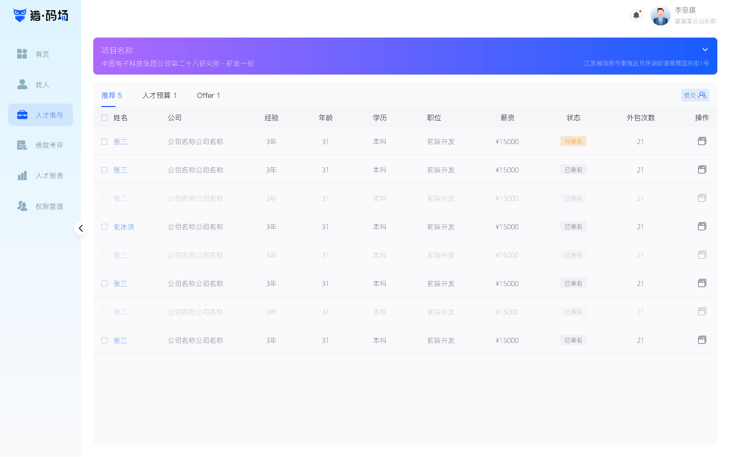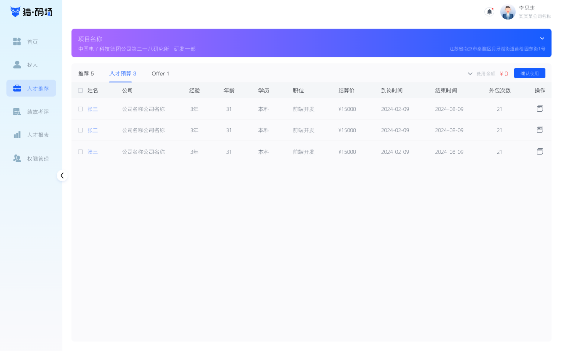 平台推荐的人才会显示在「人才推荐」页面中,点击对应的项目可查看人才,选取所需要的人才,点击右上角的「提交」按钮即可,提交后的人才置灰处理。